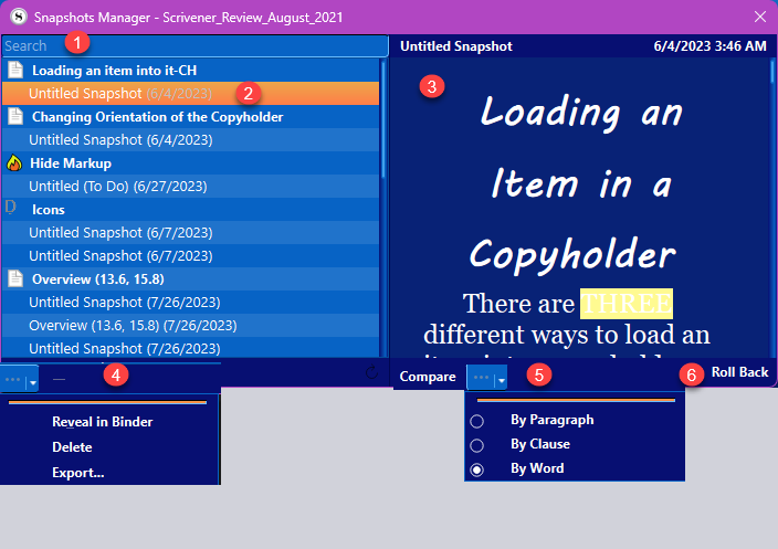 #2. The sidebar on the left contains a list of every document in the binder that has a snapshot, and then grouped within each document is a list of all the respective snapshots in reverse chronological order. If you click and highlight the name, you then see the snapshot previewed in the right panel. (#3 above) Double clicking on the name allows you to edit the snapshot. (Binder titles CANNOT be edited from within the Snapshot Manager)