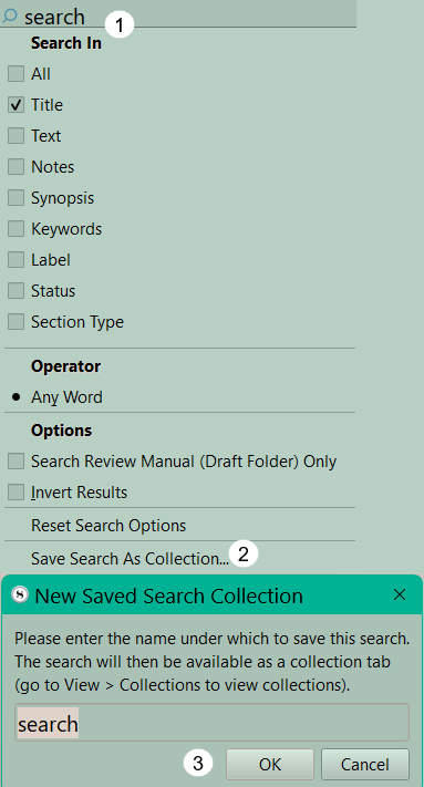 NOTE: If your search criteria is ONLY the Search Binder Selection, then you cannot save this search as a collection. The option is grayed out on purpose as this type of collection could be a single file or small group and thus unlikely to be a productive search collection.