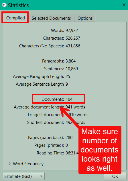 2nd-Only have one manuscript in your draft folder. If you have multiple manuscripts, it can be confusing as to which gets compiled in which book. If you have a series of books, make sure you clearly identify your current Compile target. Make sure you have chosen the right Front and Back Matter folders for the book you are Compiling. If you have different Front and Back Matter folders per output, then make sure these special output folders are clearly labeled. All Chapters and Scenes in the Draft/Manuscript folder are usually included in the compile process but do not have to be.