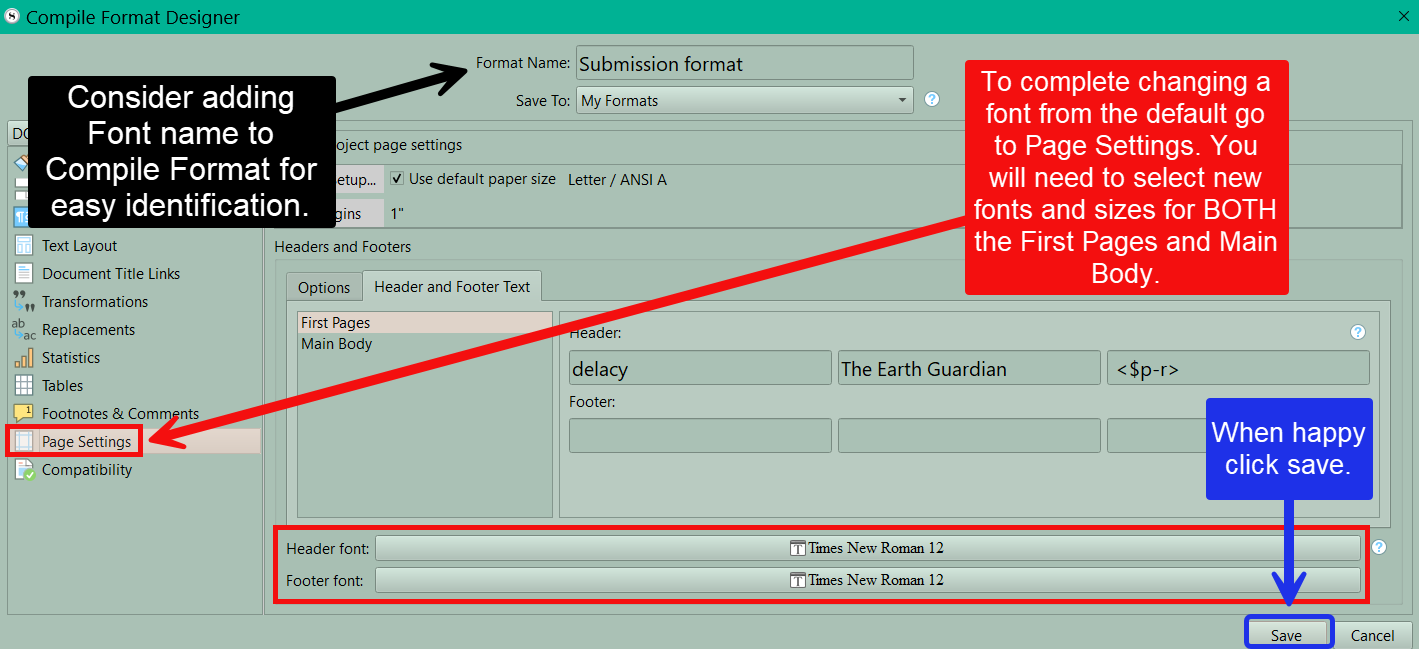 The actions above will not change the font of the headers and footers for the Compile Output. For that go to Page Settings in the Compile Format Designer. See below.