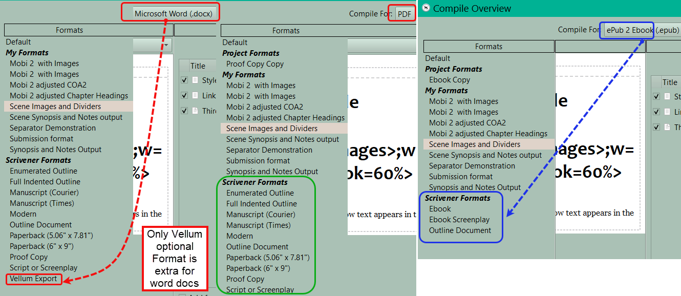 You have the option of restricting a custom format to only certain types of Compile Outputs. When you open the Compile Format Designer, you can specify which types of Compile Outputs a specific Format will support. If a Compile format does not support an Output like Epub then the Compile Format will not appear in the list of Compile formats when you choose to compile an Ebook. See below where you can customize (limit) which outputs a Compile Format will support by unchecking boxes.