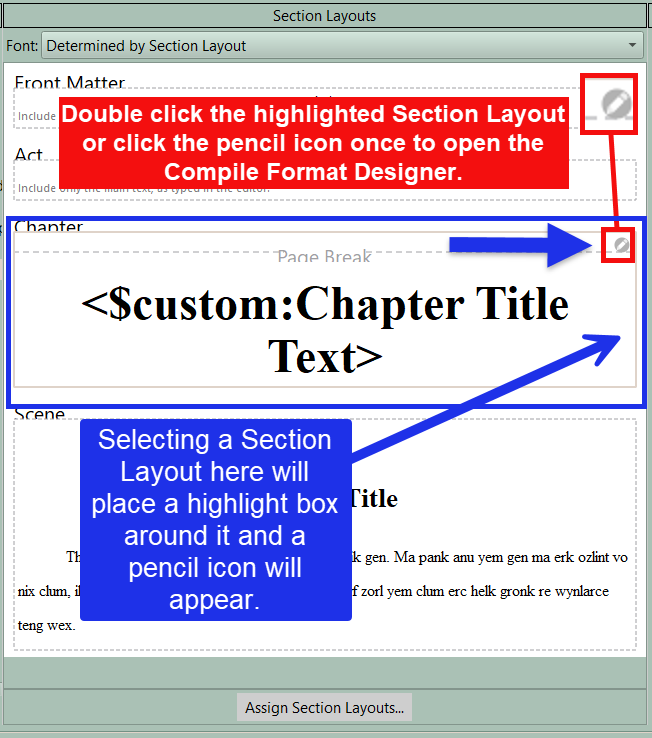To confirm the changes are displaying what you want, Save your changes to the Compile format and close this window. Go back to the Compile Panel and now click the Assign Section Layout button in the middle pane and you will see how your newly created and assigned Section Layouts will appear when you Compile. The Section Layout’s name is listed below it. (See the image below.)