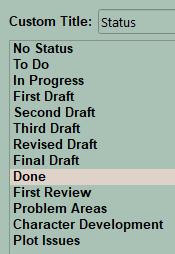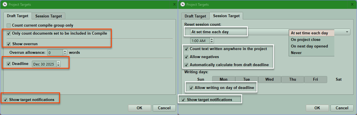 You can reach by the Menu command Project > Project Target and set a word count for your Project and a Session Target based on how many days a week you write and your projected finish date. These can be set by clicking the options button on the Project Target Panel. Setting these goals can give you the incentive and drive to finish your novel.