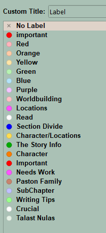 You can even have Keywords, or labels for the editing/revision process such as Critique Partner, Beta Readers, Editor review, reviewed with software like Prowriting Aid, or Grammerly. These can be used to create Collections of scenes as the editing/review process unfolds without having to put these in separate folders. You could list a key for how you will use Keywords in this project.