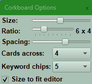 The Corkboard’s Index Card has limited space and if you exceed this you will see … to indicate more text is available but not seen. How much of the Synopsis is seen is based on the font size in the Synopsis and how you space the Index cards. You can adjust the Index Card appearance by clicking this icon in the footer and adjusting settings on the panel below.