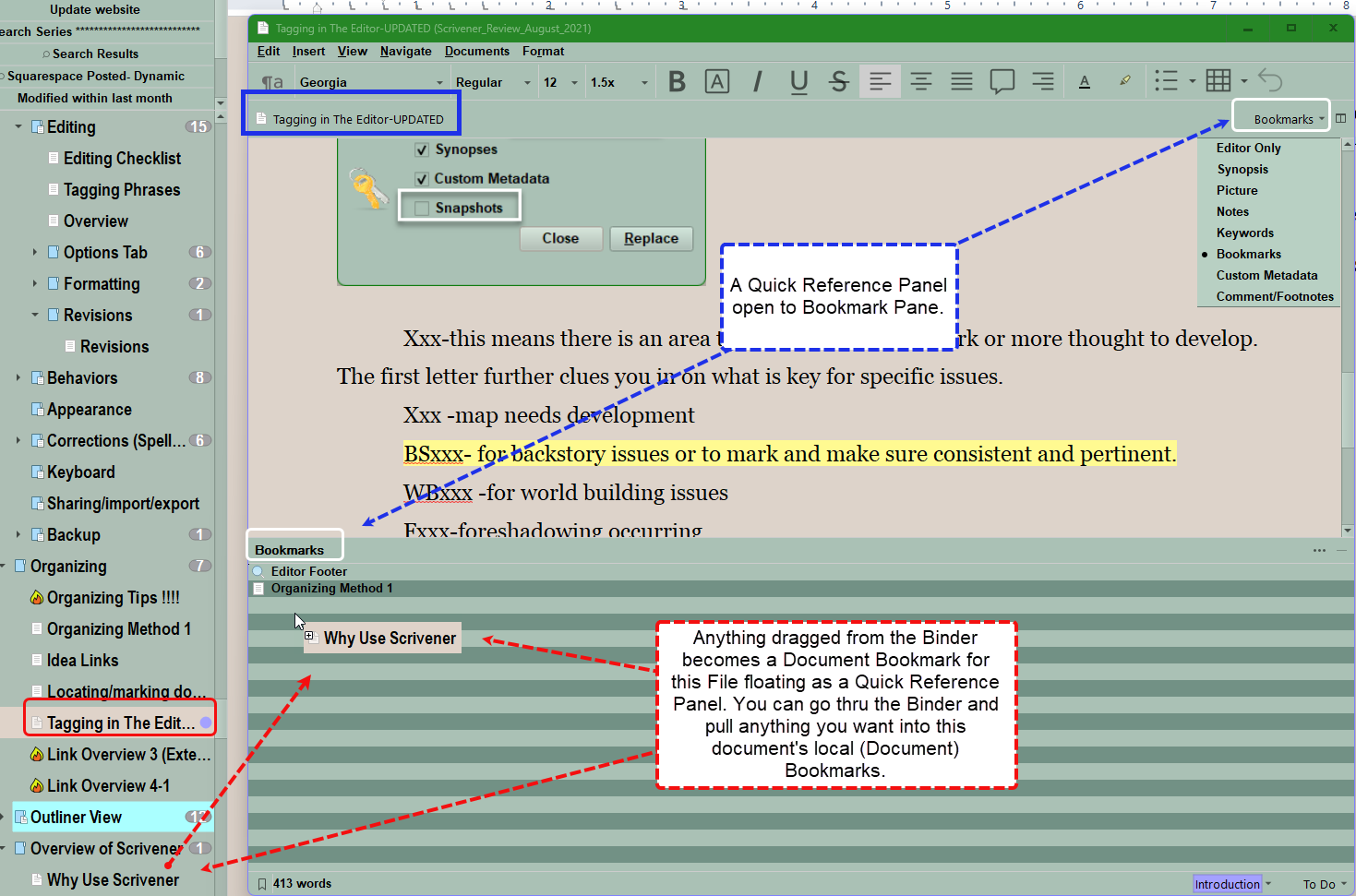(See an example of this in action below.) Now this floating panel can sit on the computer and any document in the Binder can be dragged in to create a Document Bookmark to refer to for this file. (see below)
