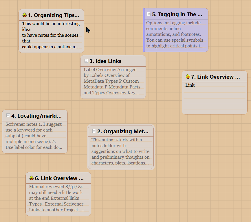 The Corkboard has a Freeform Mode to move Index cards around WITHOUT changing the Binder order. This allows you to experiment with alternate ways to construct your story. Click the Icon below in the footer to activate this choice and see an example below.