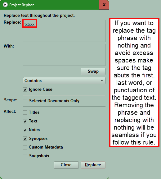 When you are done with this process, use the Project Replace function to clean up any residual tags. To do this seamlessly you want the tagged phrase removed without leaving excess spaces. Replacing the tagged word with NOTHING, will not leave empty spaces behind.