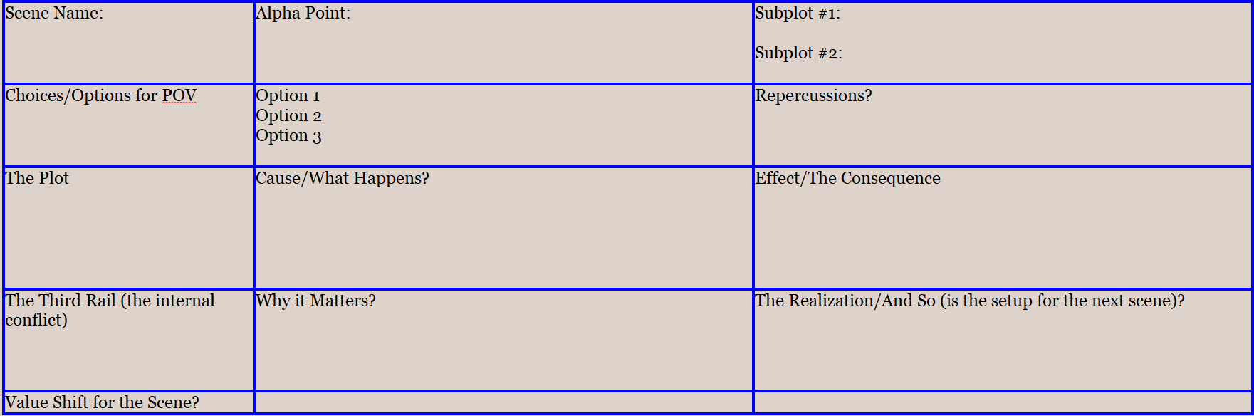 These are reusable documents stored in a special folder you designate. These can be anything you want such as a character questionnaire, scene planner, or a blank Scene template with preset word targets, and note questions to help guide your writing. You could have a Chapter template with built in Scenes to add if you need additional Chapters as the story evolves. For starting a new novel consider using a custom Project Template which uses the framework of how you work. Document Templates can be added anywhere you need in the Binder and can mimic anything you can put in a normal document in your manuscript, including tables, lists, and images. These eliminate repetitive copy and pasting. For example, you could have a simple scene table to focus your writing attached to every scene like this. You can assign a compile status, or even a different Status, Section Type, or Keyword to make these easy to find/isolate or remove if needed. They could even have a special icon to distinguish from other parts of the Manuscript. (If you include Scene Creator templates which are working notes for the Scene, then this would be set to NOT include in your Compile output.)