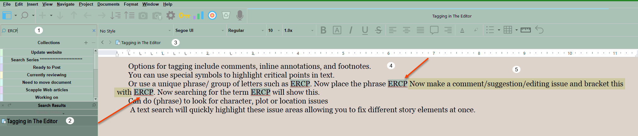 You can use symbols (!!!, ###, or ***) or unique letter groupings (Pxxx, Mxxx, WBxxx)to highlight/tag critical points in text. Using symbol or letter combinations not found normally when writing take advantage of Scrivener’s Project Search function to find exact text locations.