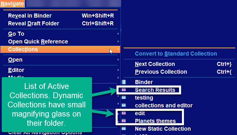 As shown above, the small Window above the Binder has a limited space to potentially display Collections (with the newest at top) followed by your last Project Search Results regardless of whether the Search Collection was saved. The current Search Results only become a permanent Dynamic collection if you use the Save Search as Collection option at the bottom of the search menu when you LEFT click on the search bar magnifying glass icon. When you click on a Collection the results will be displayed below the Collections area and replace the Binder view. Clicking the X in the Collection header will restore the Binder view. Clicking on the Binder name above the Collection also restores the Binder view.
