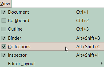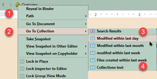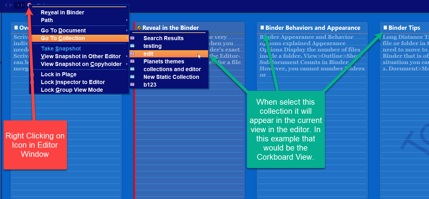 Right-clicking on the icon of the current file or folder in the Editor window shows the option to go directly to Collections. If you choose a collection it will display in the Editor window in the Scrivenings, Corkboard, or Outliner Views. The view will be determined by the current configuration of the Editor. If you are in the Outliner View, then the collection will be displayed in the Outliner View initially.