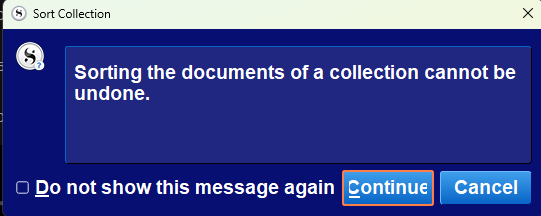 When you do this, you will see a warning message. After this is done, the order can be changed again by manually moving documents in the Collection. (You can select all the documents in the Collection and sort again as long as you use a different command than the first time.) If a document seems out of alphabetical order looks closely at the Document’s Title. If there is a space before the title begins, this will mess up alphabetical sorting. You can correct this by editing the Document title and removing the space.