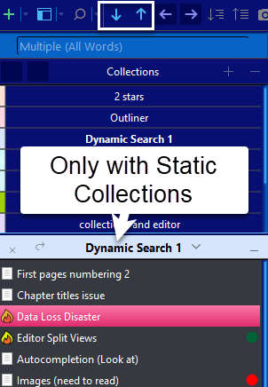 11. ONLY Static Collections allow files or folders to be moved inside a collection (or added/removed from the collection). You can only move documents up and down and not left or right using the Main Toolbar arrows (if added) or drag the file(s) up and down with the mouse. The usable toolbar icon arrows you can use will be larger/highlighted. You can shift multiple files/folders if selected within a Static Collection. (Files can not be shifted in Dynamic Collections).