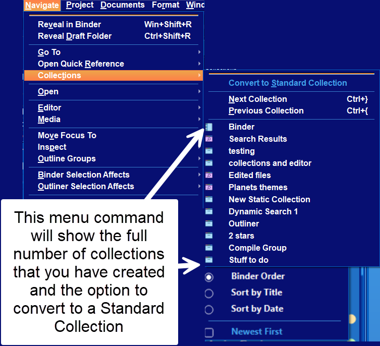 Whereas the Collection list displayed using the Menu command Navigate > Collections shows a complete list of Collections arranged from the oldest one to the newest. The window below the Project Search bar and above the Binder displays a list of your Collections.