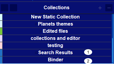 1. Above is the Collections Section below the Project Search Bar and above the Binder. Here every current Collection you created is listed here. By default you will always have the Search Results Collection which is always Dynamic and will not change till you do a new search. (You can change the position of any Collection in the list by clicking on it with the mouse and dragging it up or down the list.)