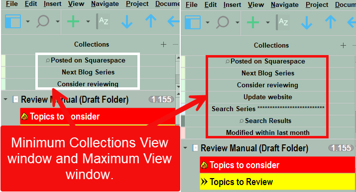 This is helpful when you have large numbers of Collections that don’t fit in the small default space allowed by Scrivener. You can move frequently used Collections (by dragging it) to the top of the list including Search Results to make the currently important Collections easy to find.