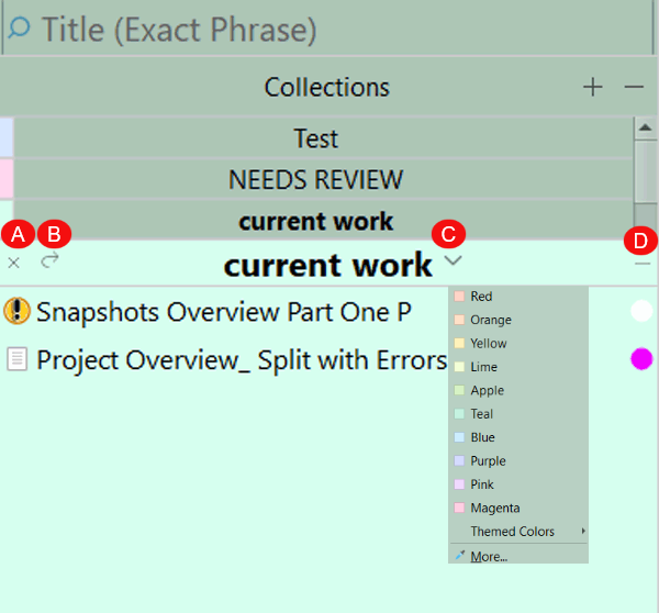 D. Here your only choices are to add files from the Binder to this collection or whether to delete the currently highlighted file(s) by clicking the minus sign. The minus sign (see D above) allows removal of any single or multiple highlighted files/folder from your Static Collection. (By holding the Ctrl key you can select and remove multiple items at once.) Remember, you are not removing Binder files or folders, but merely the shortcuts to those files in your project. With Static Collections it is easy to add or subtract documents in the collection.