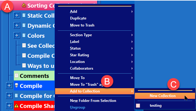9. If you Right Click on a single or multiple Binder documents at once, then you have the option to add that file(s) or folder(s) to any of your current Standard (Static) collections. You can use this option as you’re going through your binder to add particular files that you would find useful for a particular function such as a research collection, files related to a location, or point of view character. You can even create a new collection as well.
