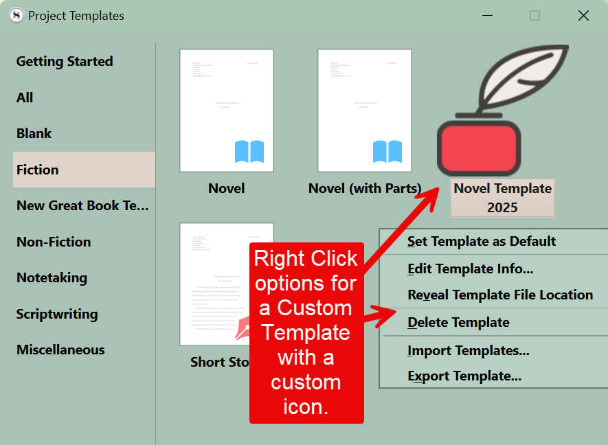 Once you customize the Project Template and save it, then the copies of that project template and all other project templates are stored at the same folder location by default. This is the Scrivener Application Support Folder, but you can save a copy anywhere else as well. Note in the Project Template window you have various buttons with choices at the bottom. One is Options tab which includes the Reveal Template File location and you can use this to go there and copy the Template file and save elsewhere like a cloud based folder or to share with others by exporting. This way you can create your own Custom Novel Template and base it on an actual book project you have used and customized. This can serve as the basis for an improved custom Project Template that can be upgraded over time and give you a head start on new Scrivener Projects in the future..